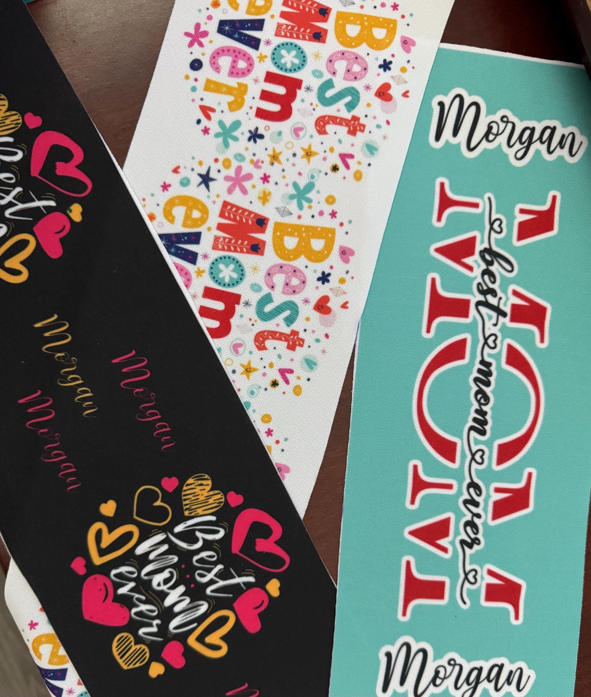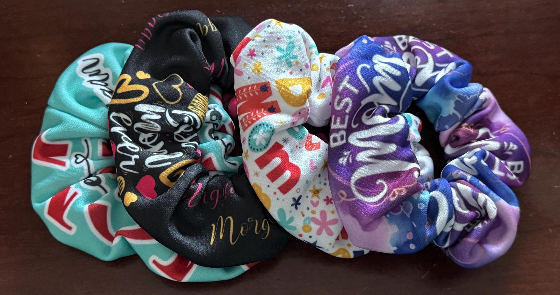These high quality handmade scrunchies are personalizable and thus the perfect, unique gift for mom. Two of the scrunchies have the option to add mom's name or even add children's names. These are vibrantly colored, machine washable, and are durable for long time use. Perfect for thick or thin hair and a gift mom is sure to love!