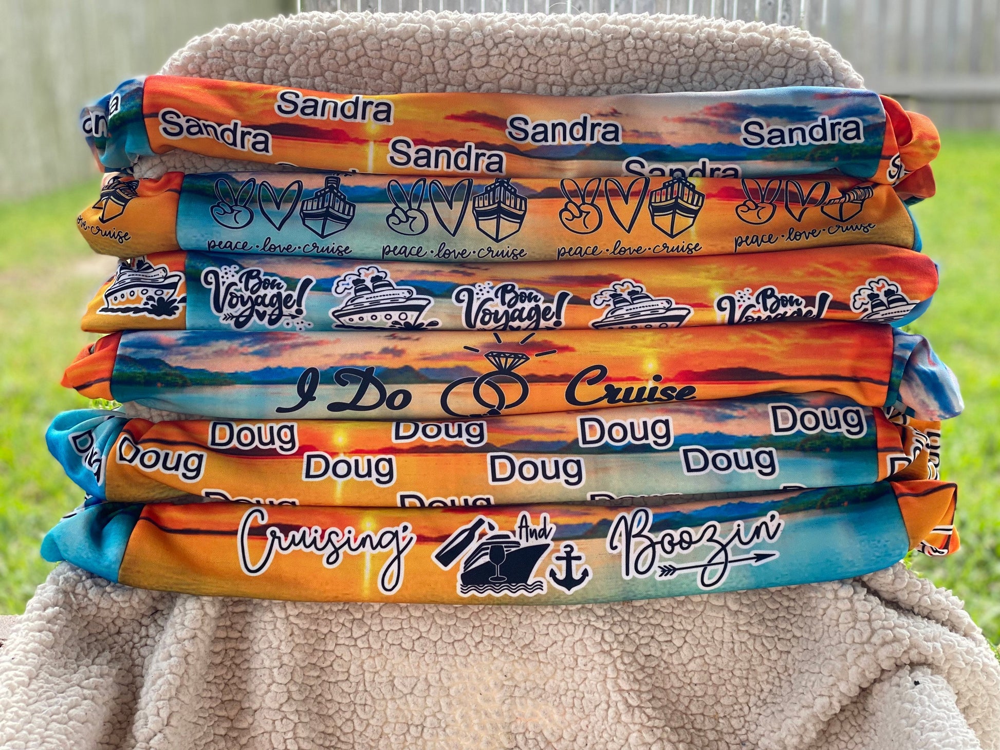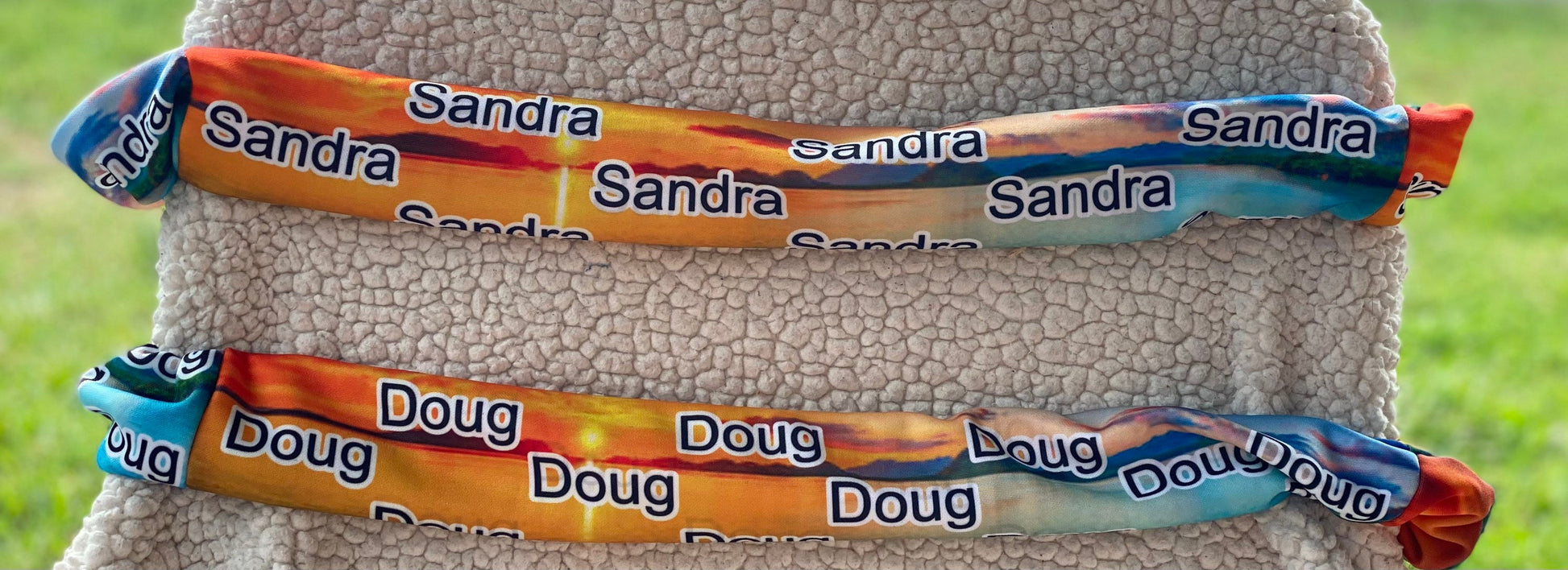 This stretchy adjustable towel band is the perfect, stylish, and cute way to mark your chair at the beach, pool, or on a cruise! Personalized with any words you would like. Your name, company names, funny sayings, the choice is yours. These towel scrunchies come one per pack and they stretch from 26" - 40" to fit around any size lounge chair. Don't lose your chair in a vast sea of white towels! Get your personalized chair towel band today!