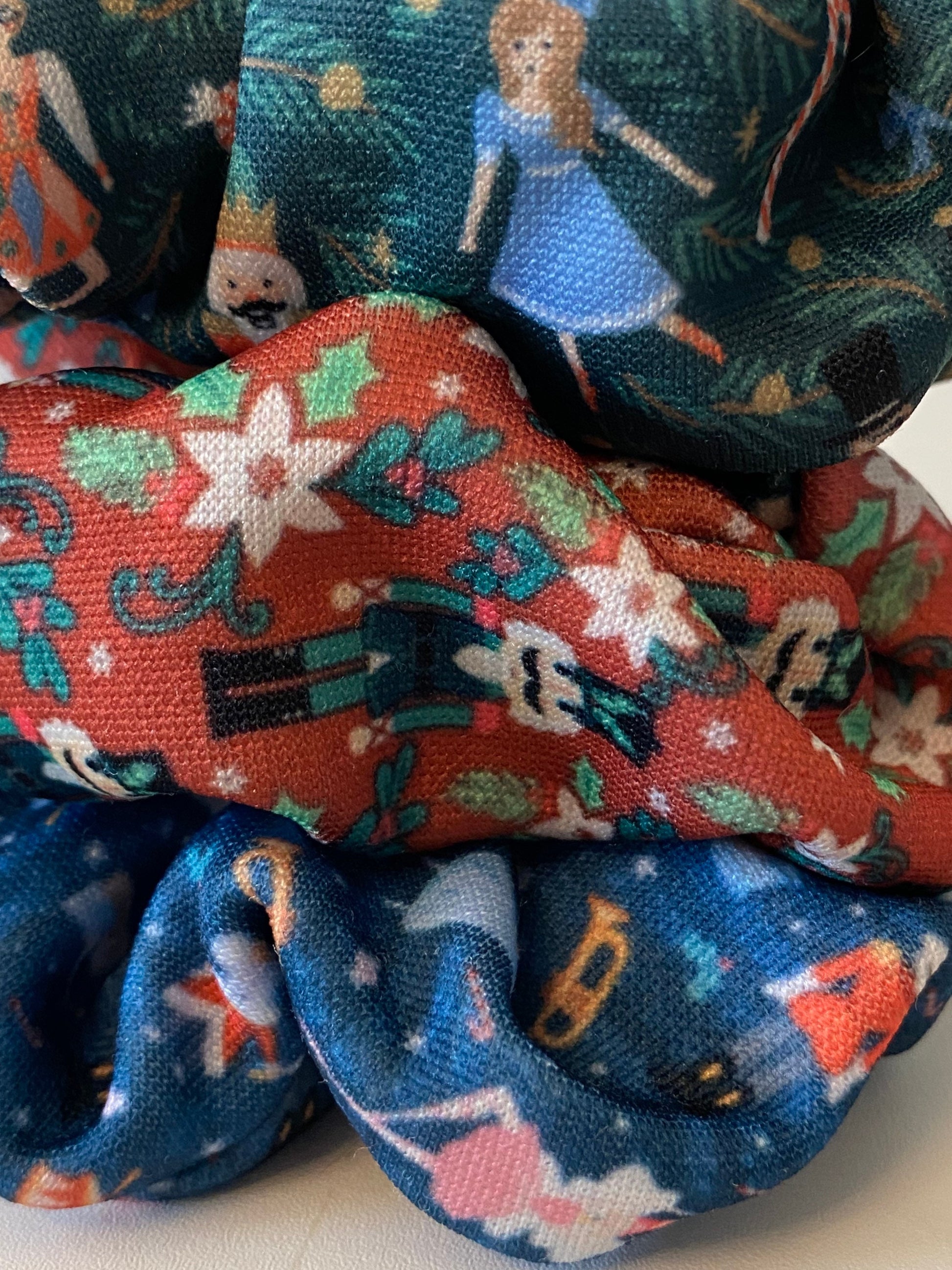 These handmade Nutcracker scrunchies are a cute accessory to any Christmas outfit. They are also fun year round and the colors match every outfit. They are made of a thick high quality material that will last. These are always a great secret Santa gift and so fun to gift friends, family, and coworkers! Great for thick and thin hair and also make a cute accessory to wear on your wrist.