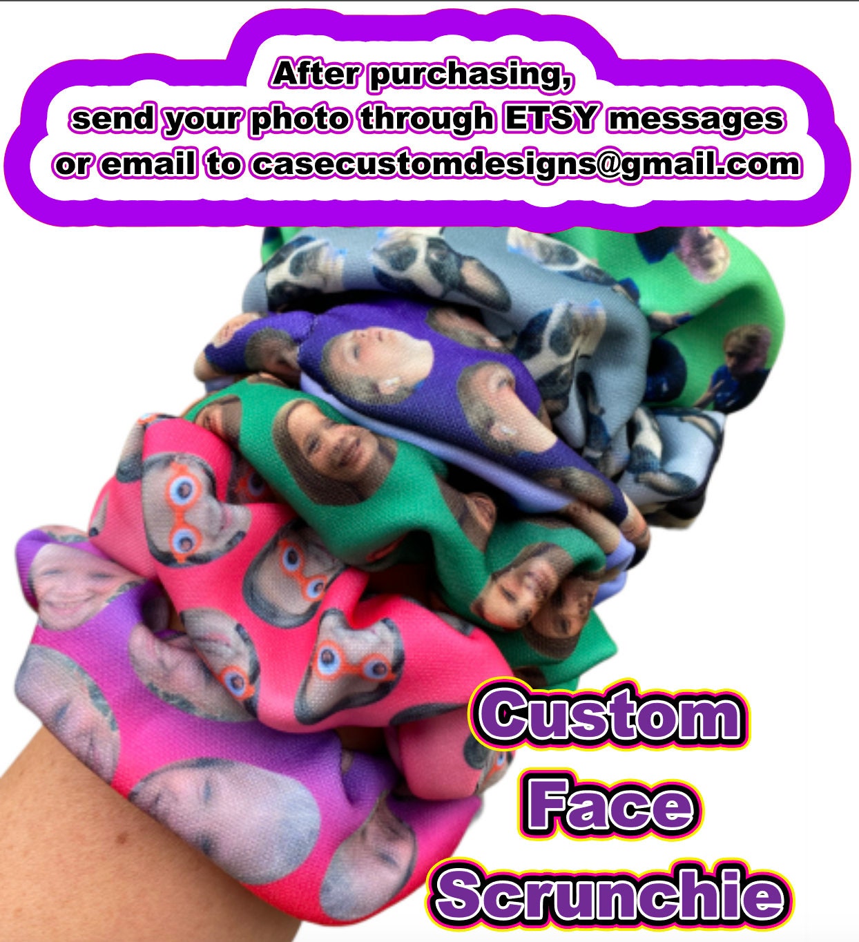 These super bright, beautifully colored scrunchies are the perfect accessory for girls of all ages. Are you looking for a unique birthday gift? Look no further, these are the perfect, unique, and unexpected gift you are looking for. These customized face scrunchies also make the most perfect Christmas presets and stocking stuffers.